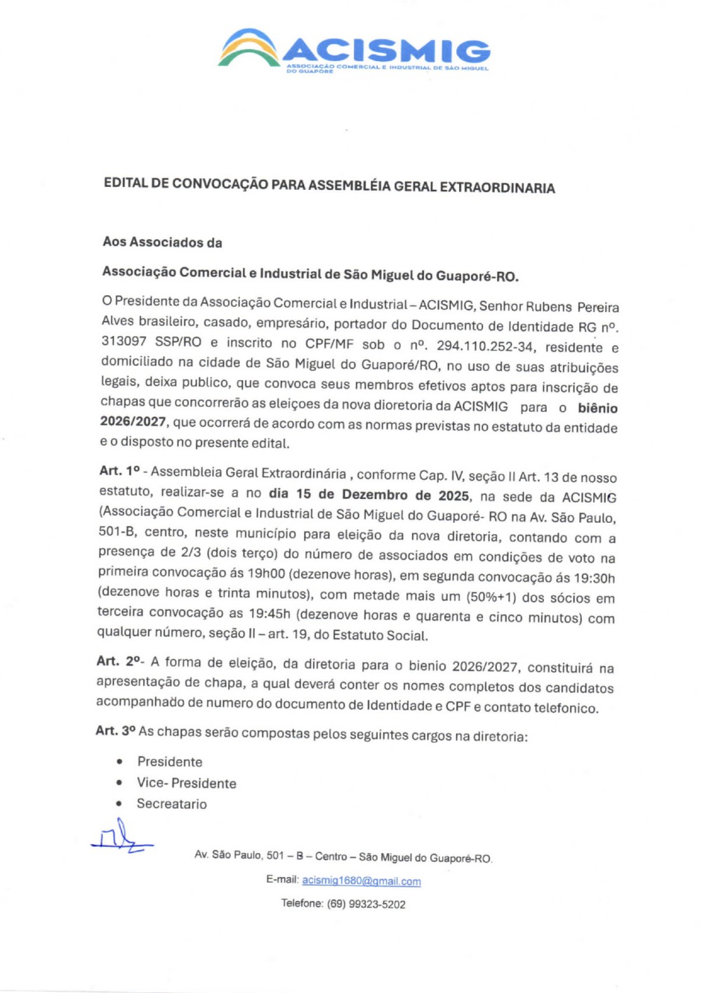 A ASSOCIAÇÃO COMERCIAL E INDUSTRIAL DE SÃO MIGUEL DO GUAPORÉ INFORMA QUE Encontra-se aberto o edital de convocação destinado aos associados que manifestarem interesse e atenderem aos requisitos estabelecidos no edital, para participação no processo eleitoral dos cargos da nova diretoria referente ao biênio 2026–2027.